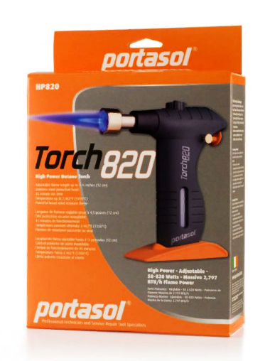 Portasol HP820 - это бутановая горелка высокой мощности с регулируемой мощностью 50-820 Вт с регулируемой длиной пламени до 12 см и температурой до 1350 ° C (2462 ° C).