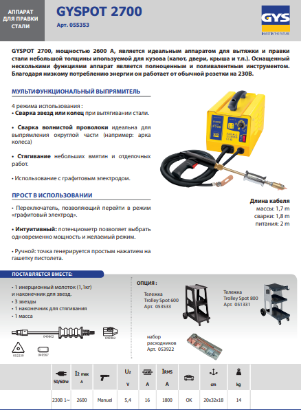 GYSPOT 2700 – аппарат для правки и вытяжки стали мощностью 2600А. Идеальный вариант для работы со сталью небольшой толщины (капоты, двери, крыши и пр.). Благодаря многофункциональности является поливалентным, полноценным инструментом и отличается низким уровнем энергопотребления. Аппарат работает от сети 230В.